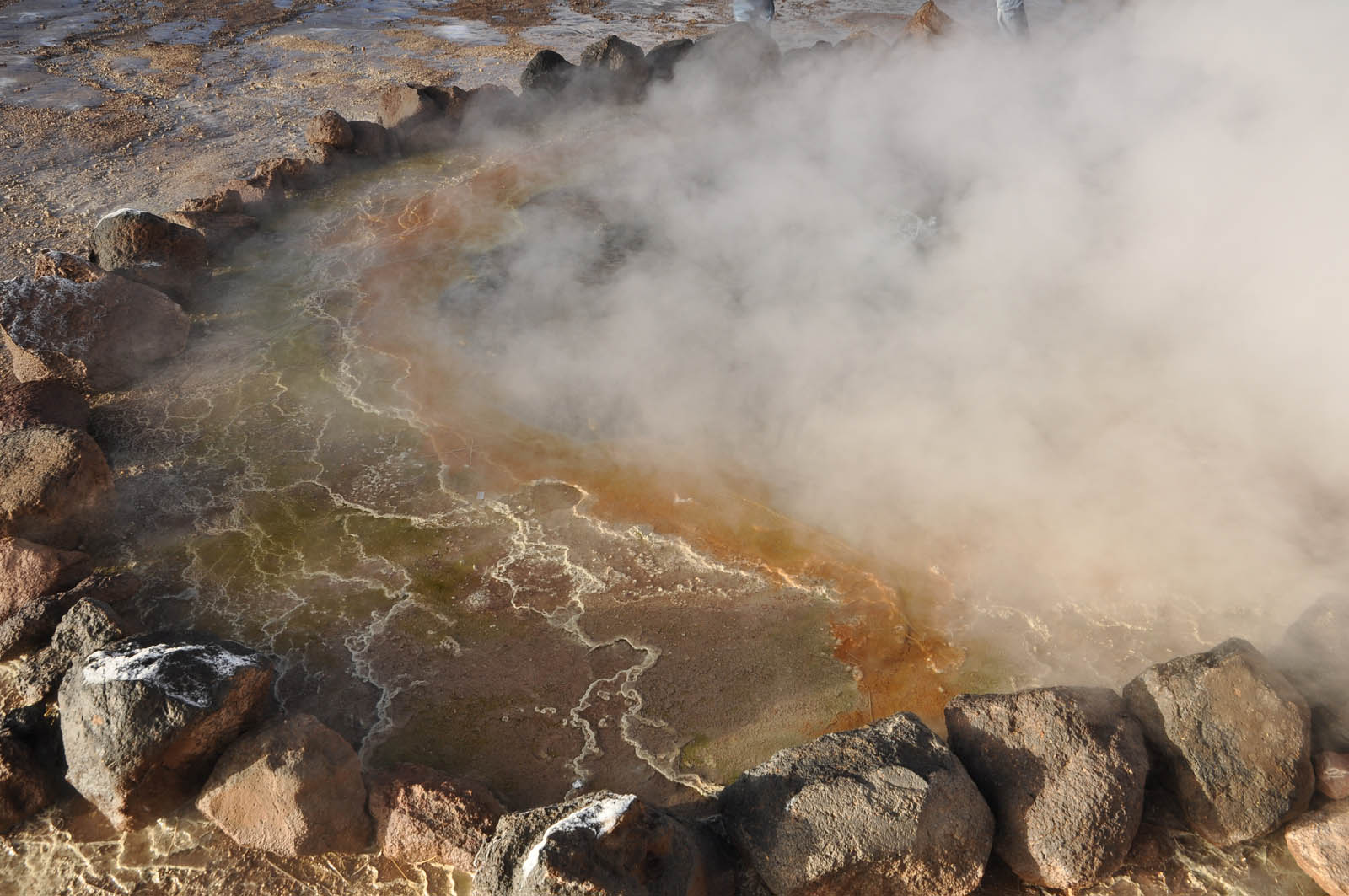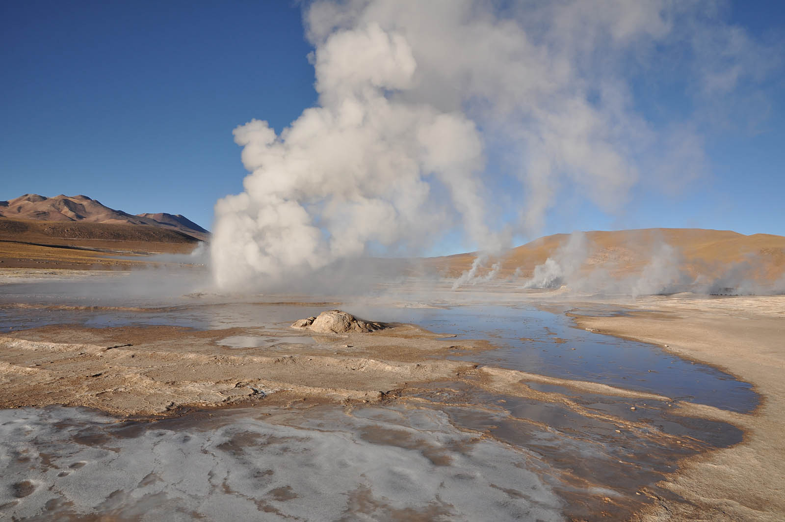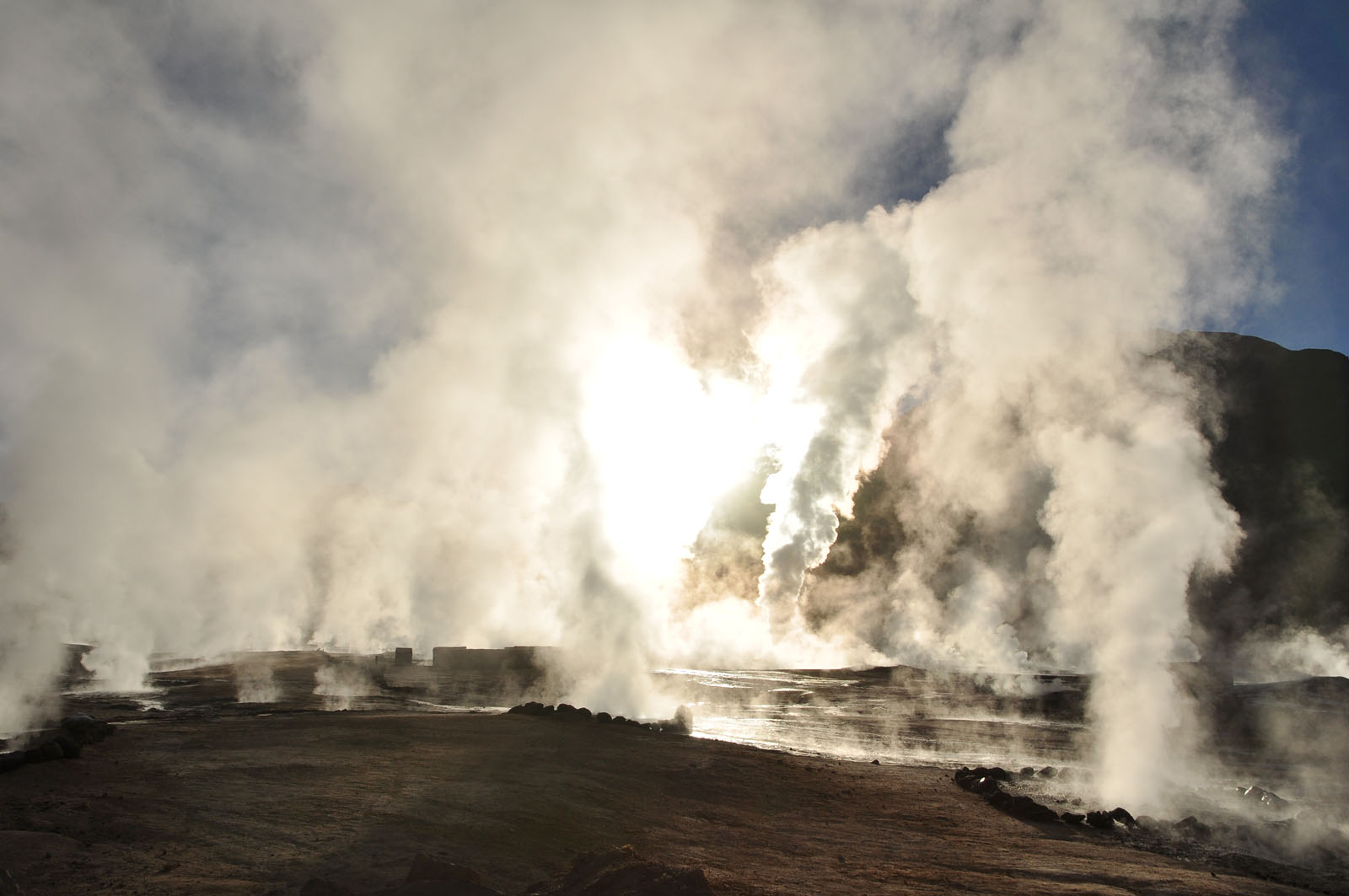 Sonnenaufgang im Winter auf dieser Hochebene doch bitterkalt. Als die Sonne aber die Geysire erleuchtete wurde das kalte Warten aber ausgiebig belohnt. Im Gegensatz zu der thermisch aktiven Zone in Bolivien sah man hier zahlreiche Geysiere ausbrechen.
