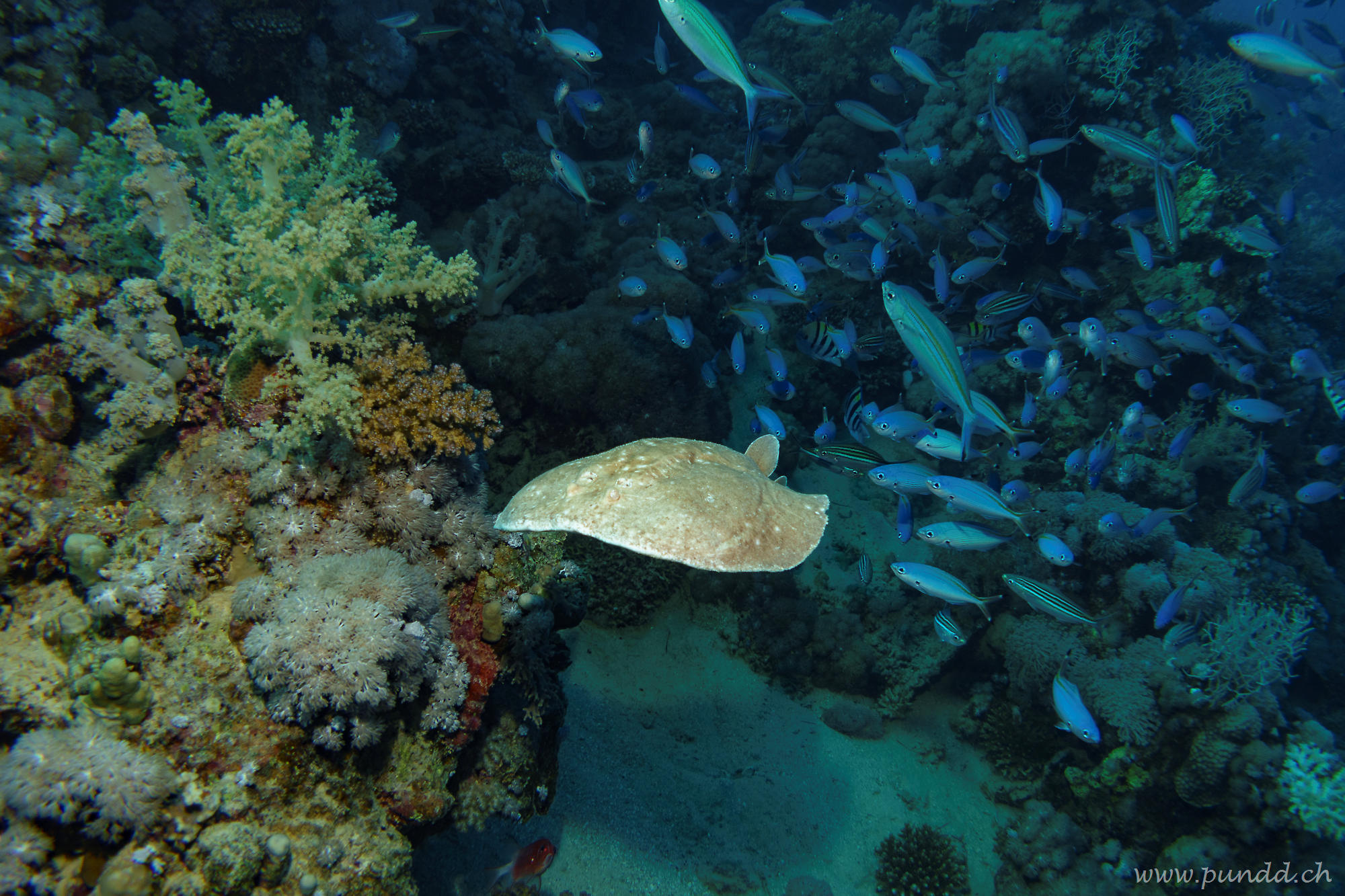 Wir hatten genügend Tauchgänge, so dass wir nach dem Willkommenstauchgang ohne Guide tauchen durften. Das war super lässig für uns: Nach dem Morgenessen konnten wir gemütlich tauchen gehen, ohne auf irgendeinen Termin warten zu müssen. Da wir als UW-Fotografen sowieso meistens etwas andere Schwerpunkte hatten als andere Taucher war es perfekt für uns, zu zweit zu Tauchen. Wir tauchten meistens in der ersten halben Stunde etwas tiefer, um dann die zweite Hälfte des Tauchgangs im farbigen oberen Teil des Riffs in 5 m tiefe zu verbringen.