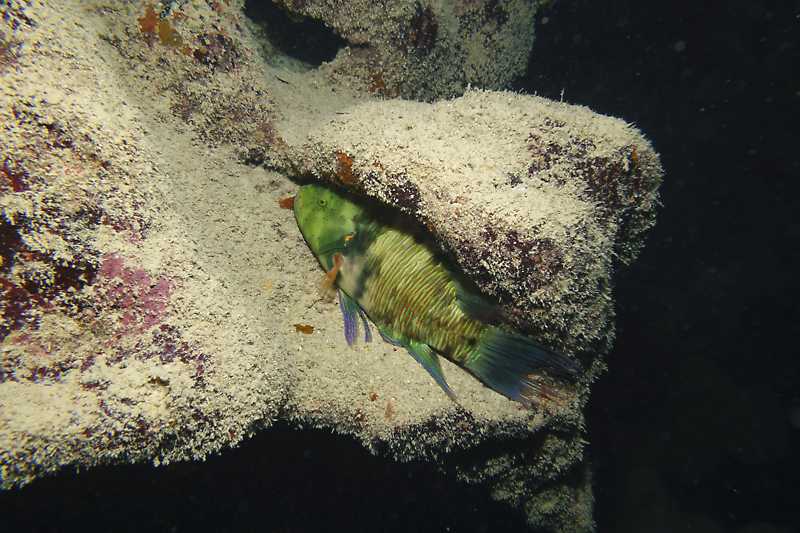 Nachttauchgänge sind immer etwas besonderes: Tiere, die man sonst kaum sieht, werden aktiv und wandern umher. Tagaktive Fische hingegen liegen gemütlich herum und schlafen.