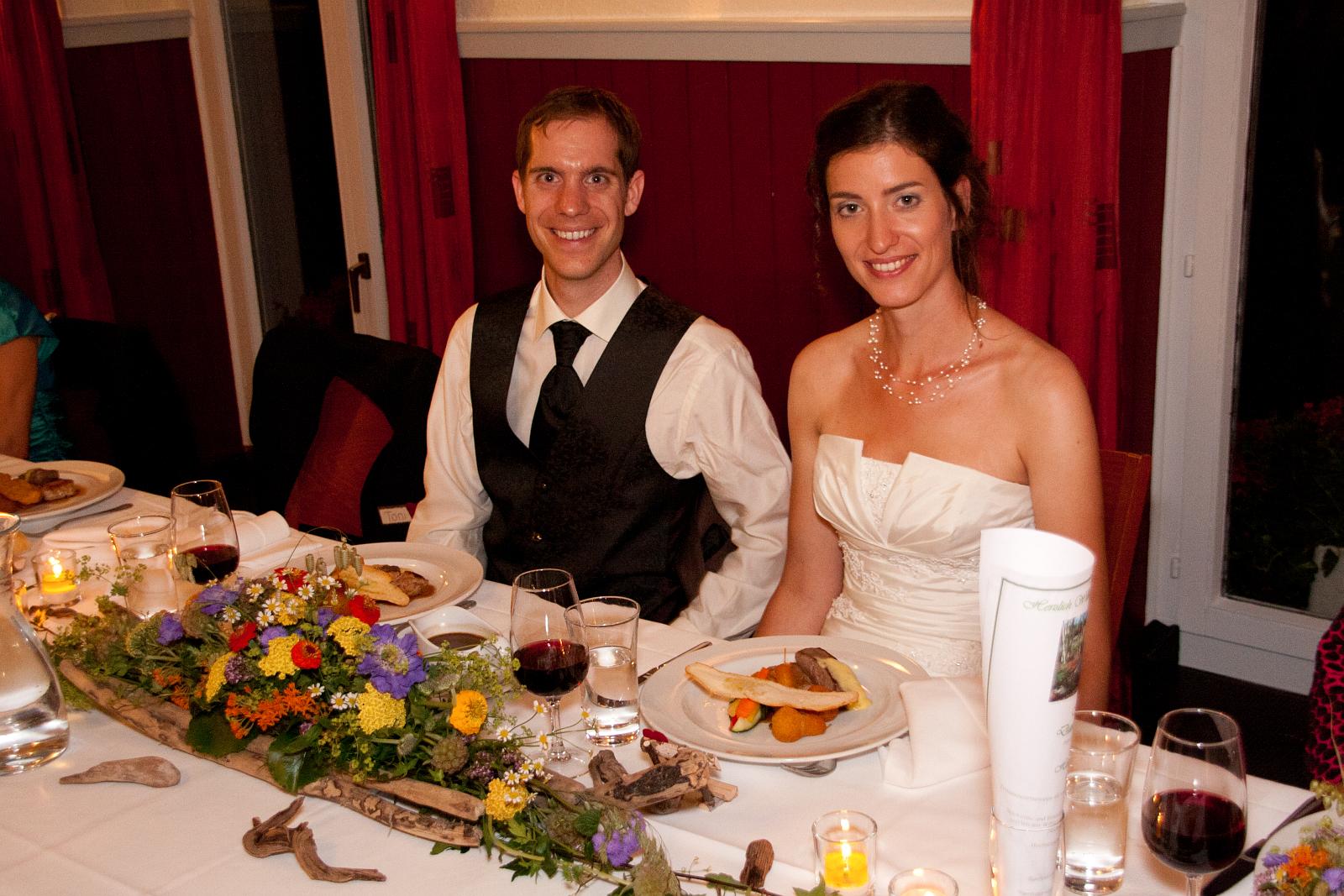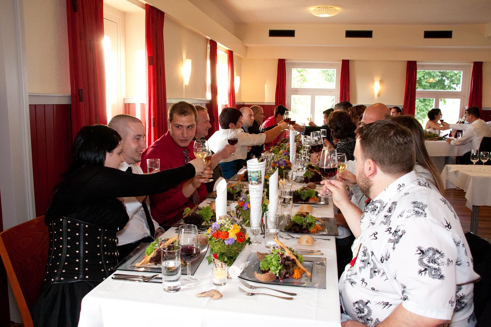 Kaum hatten wir mit dem Spielen begonnen, kam schon der zweite Gang, eine leckere Tomatensuppe. Wir lieben ja bekanntlich Tomatenspaghetti, konnten das aber selbstverständlich nicht an unserer Hochzeit servieren. So kam dann doch noch eine Tomate auf den Tisch.