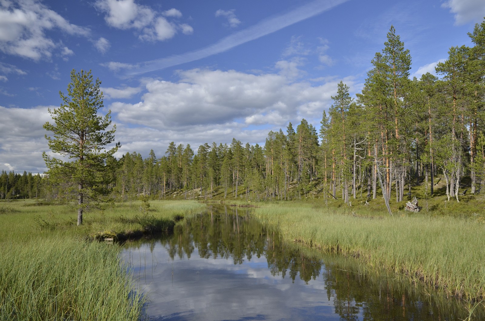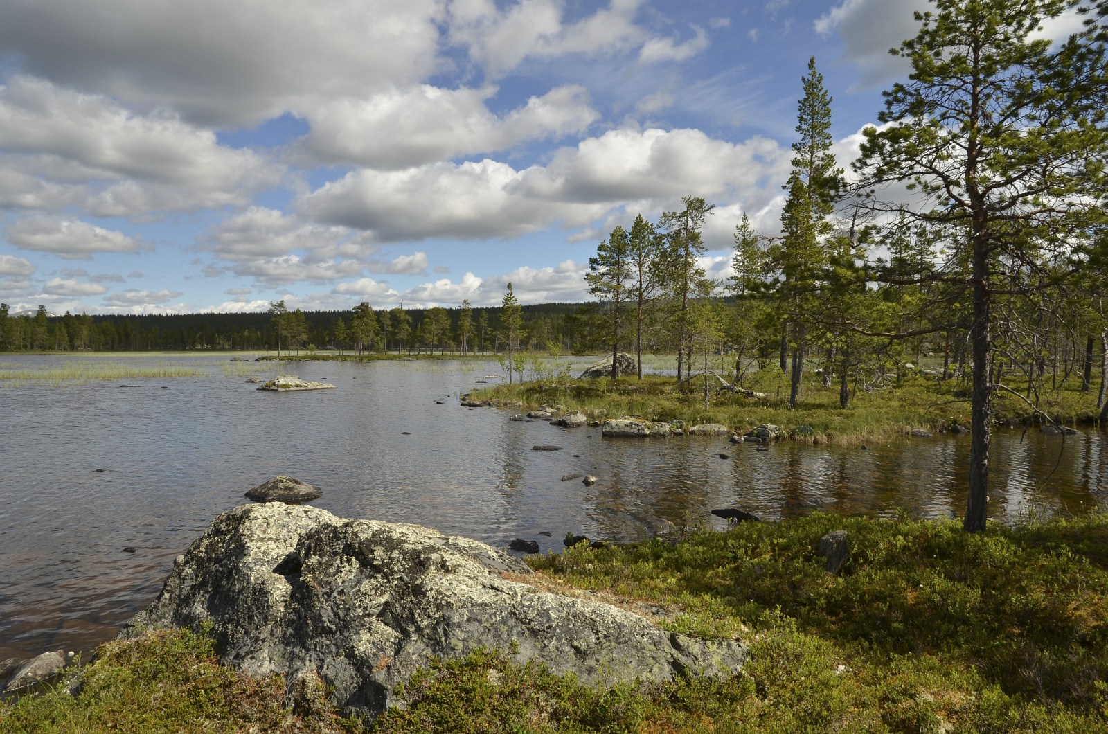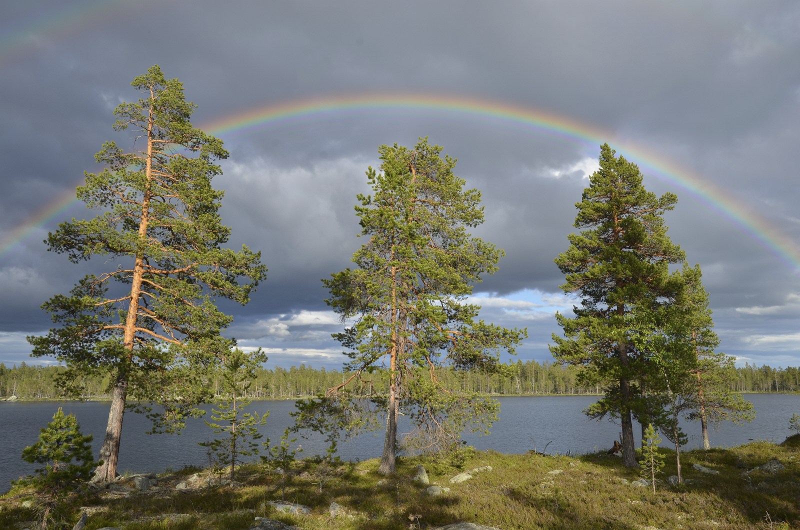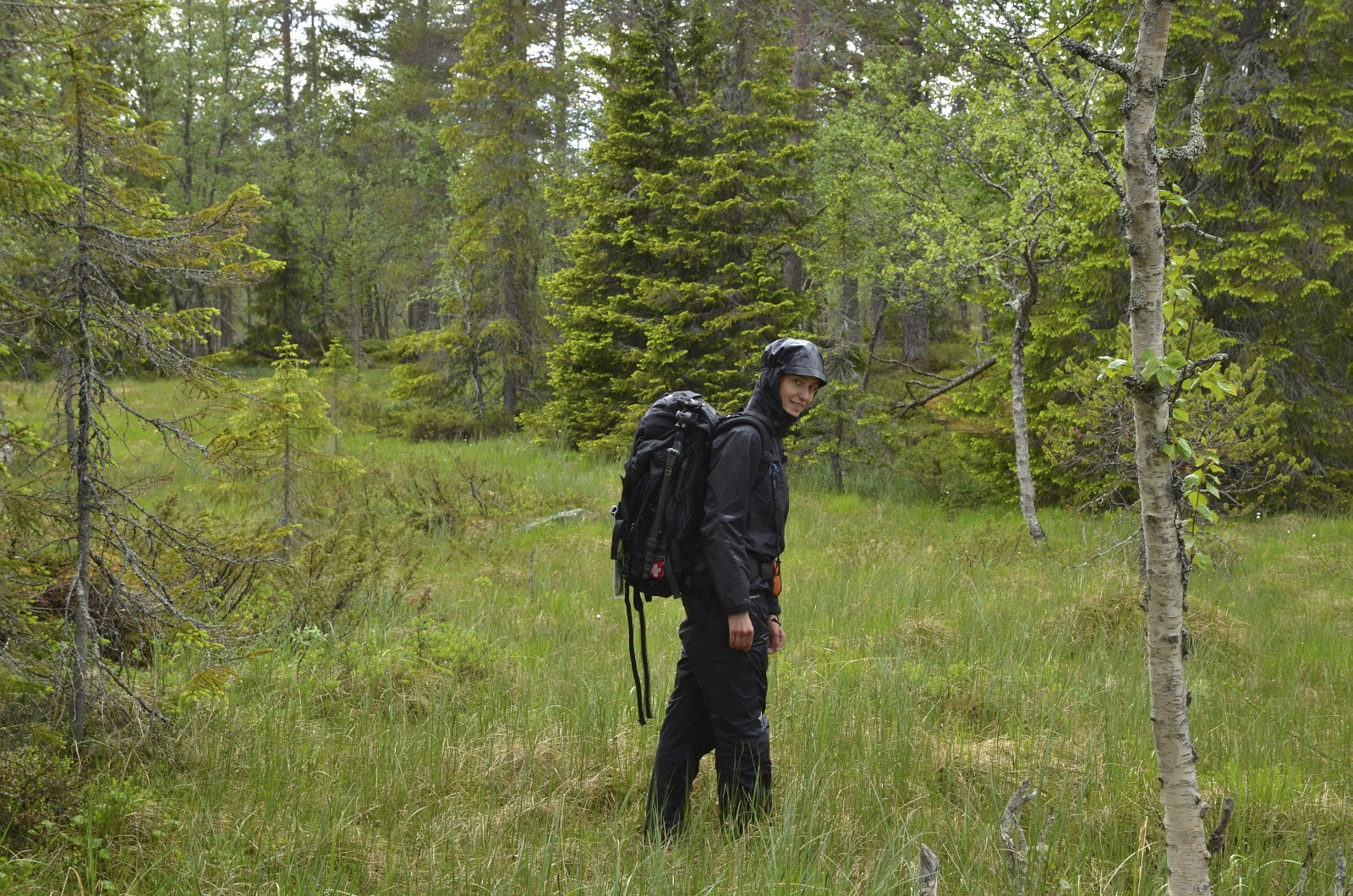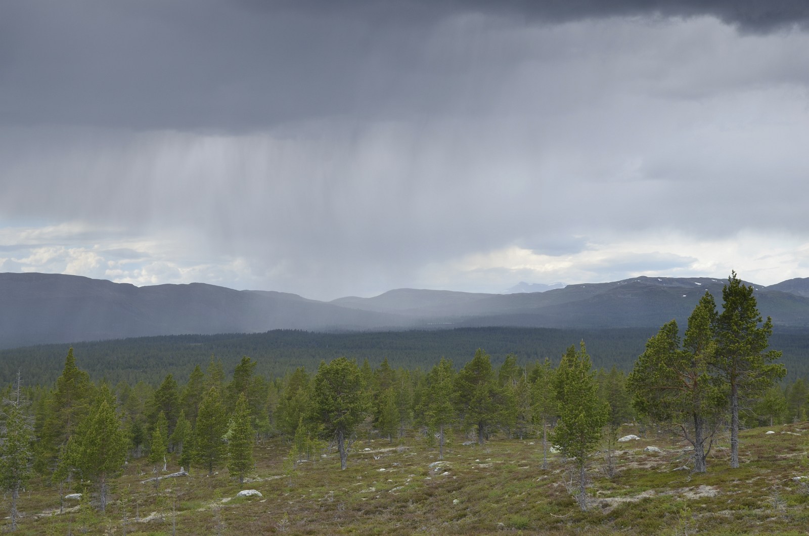 Am Nachmittag des zweiten Tages unternahmen wir eine Wanderung zum nächstgelegenen Hügel, dem Jyltingsvola. Die Tour führte uns durch einen verwunschenen Urwald mit moosbewachsenen Bäumen und dicht überwucherten, weichen Waldboden. Teilweise wanderten wir durch Moore, in denen man aufpassen musste keine nassen Schuhe zu bekommen. Auf dem Hügel angekommen, konnten wir einen spektakulären Wetterumschwung beobachten: Eine Front mit düsteren Wolken und heftig zu Boden peitschendem Regen bewegte sich auf uns zu und erreichte uns wenige Minuten später. Glücklicherweise konnten wir uns noch rechtzeitig in die Regenkleider stürzen. Der Rückweg war zwar immer noch regnerisch, aber dafür leuchteten alle Farben viel intensiver.