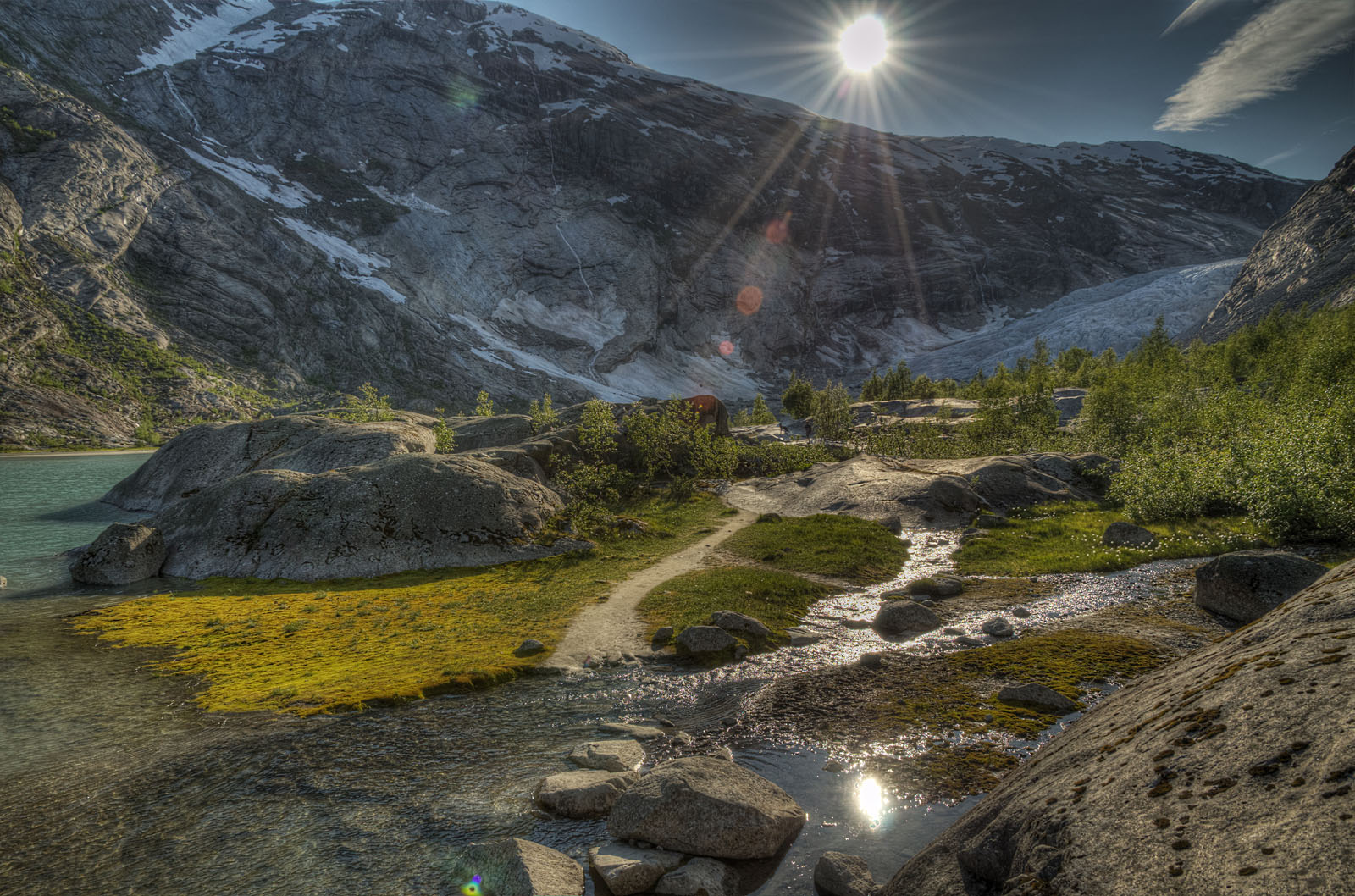 An der Vegetation und den Gletschern liess sich am einfachsten ablesen, dass wir uns im hohen Norden befanden. Die Gletscherzunge Nigardsbreen des Jostedal-Gletschers reicht immerhin bis auf 400 m ü. M. hinunter. Der Jostedal-Gletscher ist der grösste Gletscher auf dem europäischen Festland. Wir liessen es uns nicht nehmen, als Abschluss dieses grossartigen Tages im Abendlicht zur Gletscherzunge zu wandern.