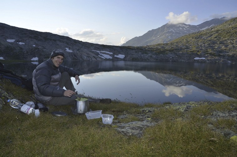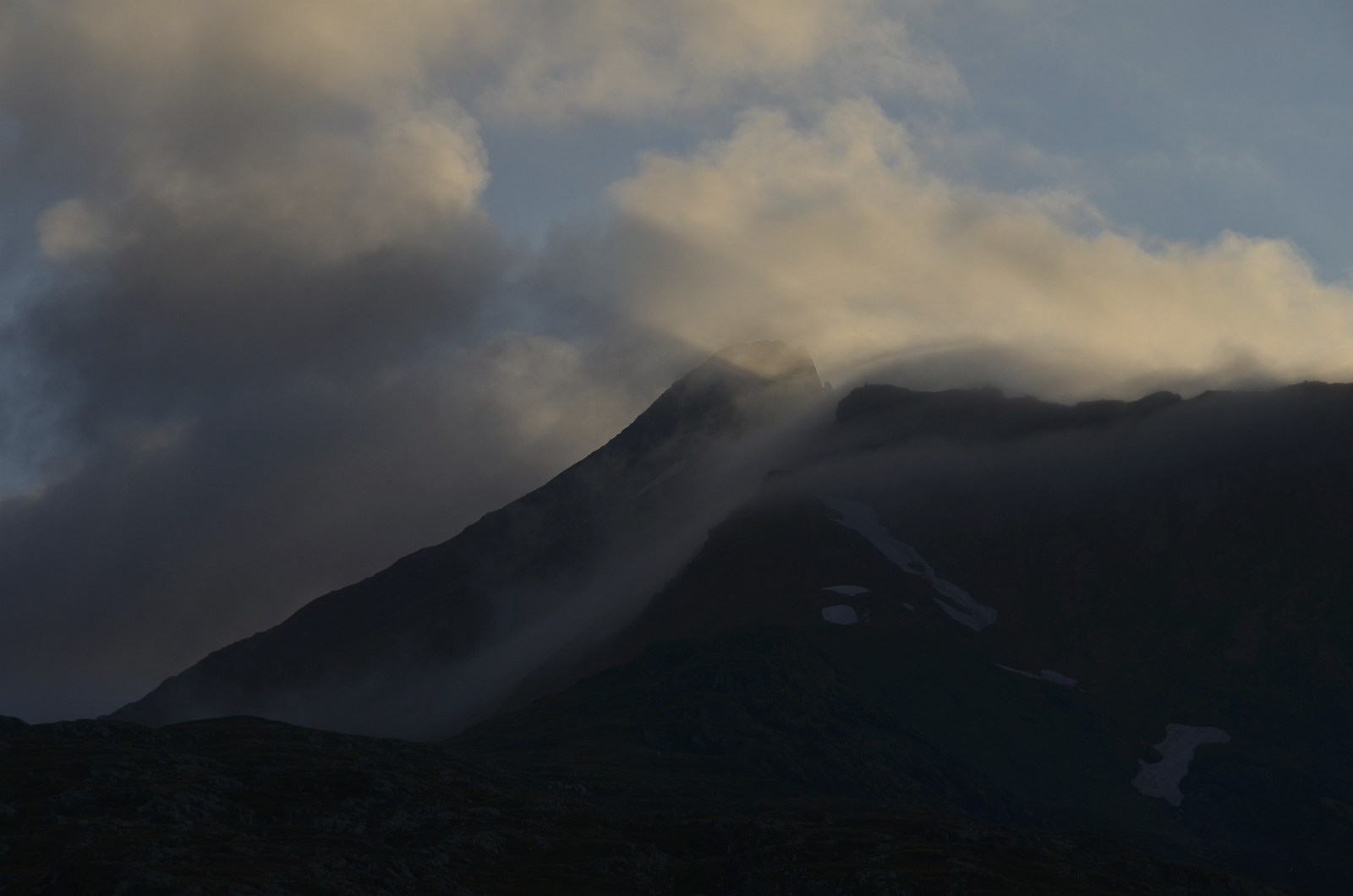 Zum Kochen suchten wir uns eine Stelle mit schöner Aussicht über dem Lago Retico aus, wo wir auch gleich den Sonnenuntergang beobachten konnten. Nach Sonnenuntergang zogen spektakuläre Wolken über die umliegenden Berge, es blieb aber schön. Diesmal bleiben wir auch von unangenehmen Sturmwinden verschont.
