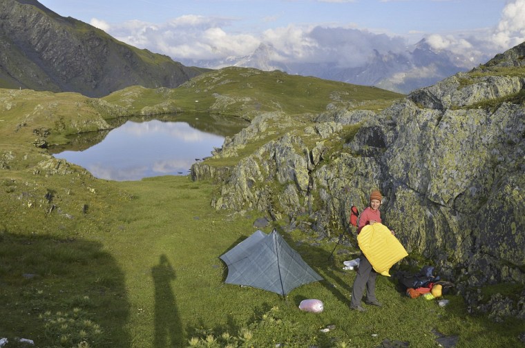 Nachdem wir bei der letzten Wanderung von einem Gewitter überrascht wurden, suchten wir uns diesmal einen besonders sicheren Platz. Glücklicherweise war der sicherste hier auch der schönste Ort. In einer kleinen Mulde direkt neben dem Lage Retico und oberhalb eines kleineren Teiches stellten wir unser Zelt zwischen zwei grosse Felsbänder.