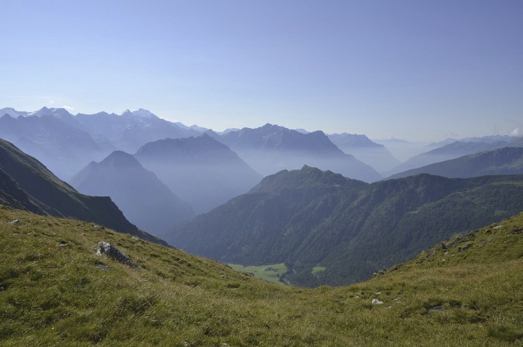 Nach längeren Diskussionen liess sich Daniela überzeugen, doch den Weg über den Grat zu machen. Sicher dazu beigetragen hat das traumhafte (und vor allem windstille) Wetter. Zuerst gings aber noch mit schöner Aussicht auf breiten Wiesen nach oben.