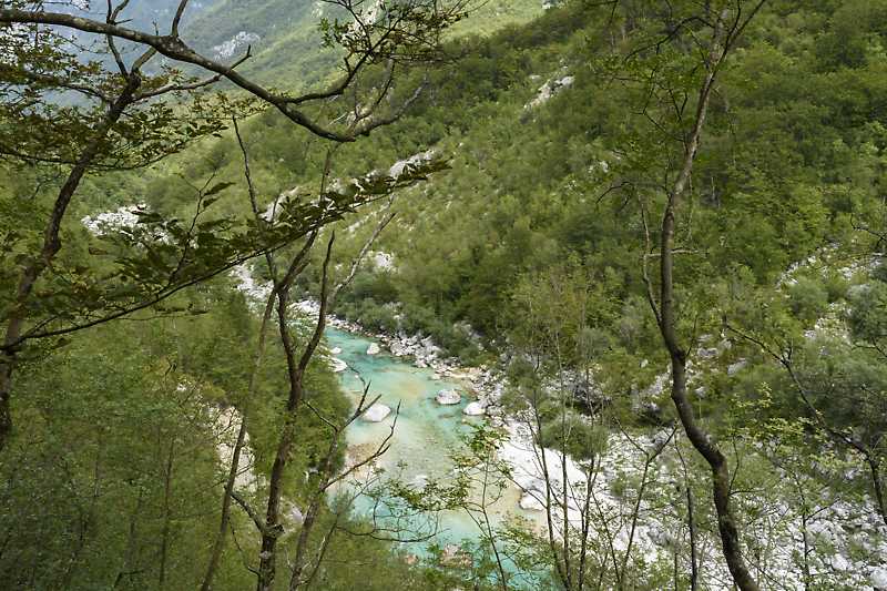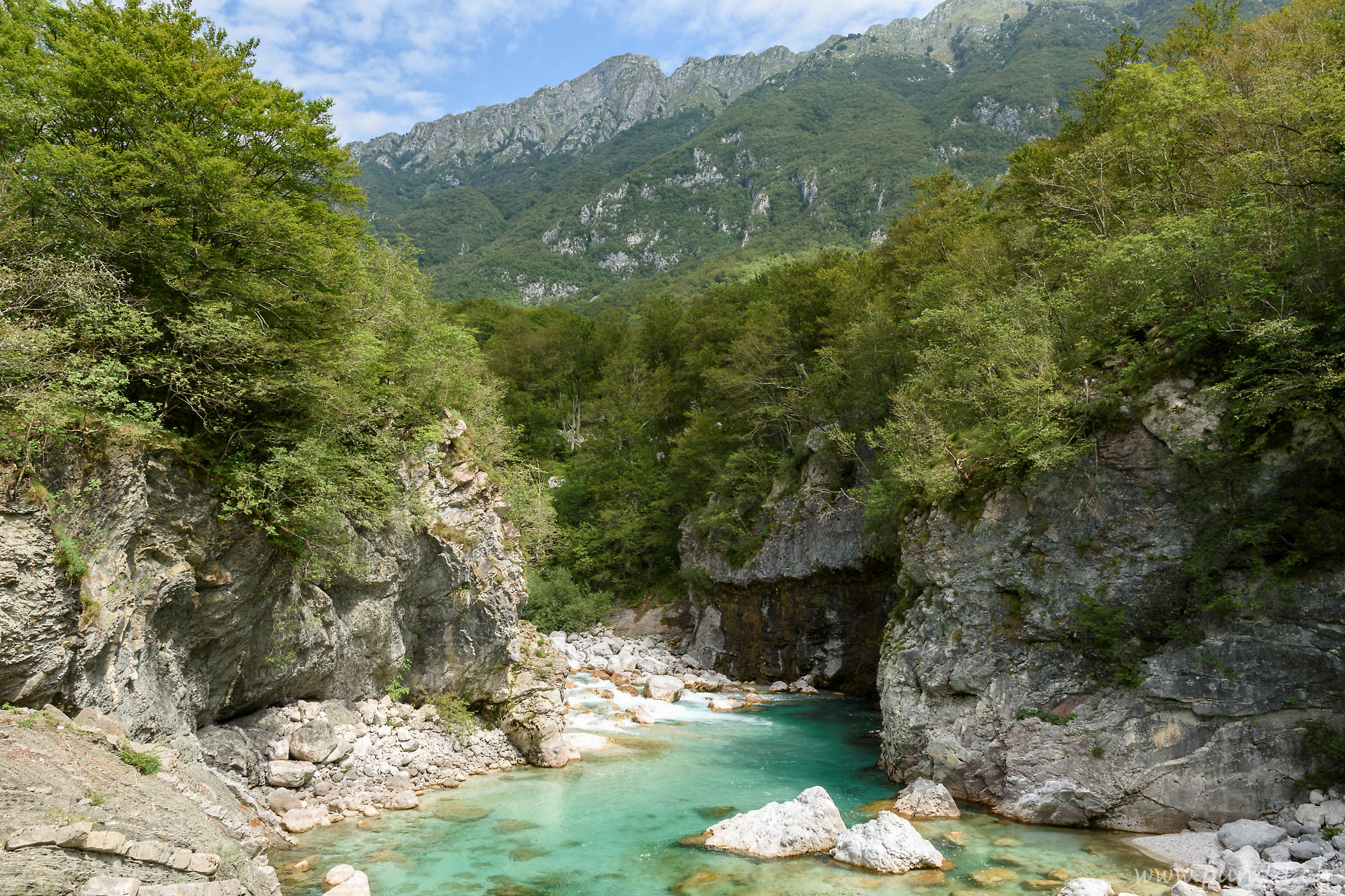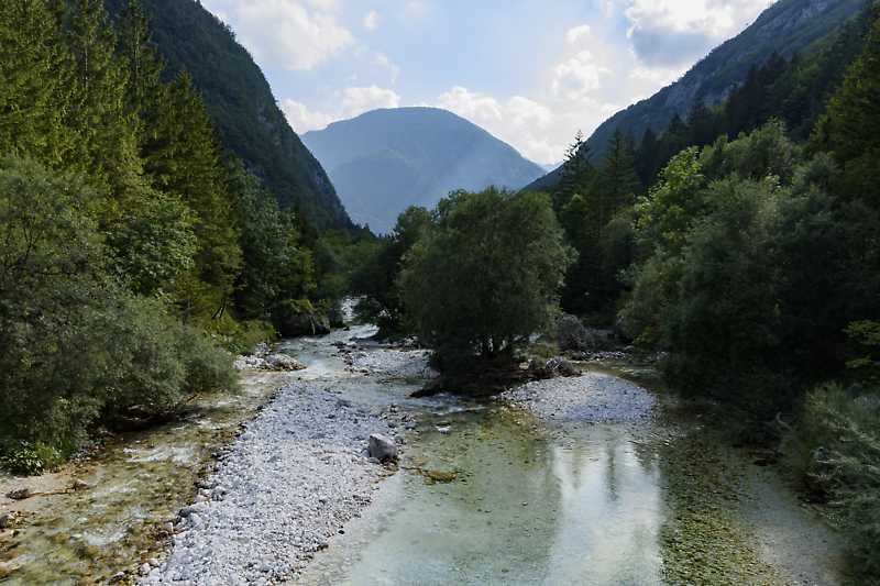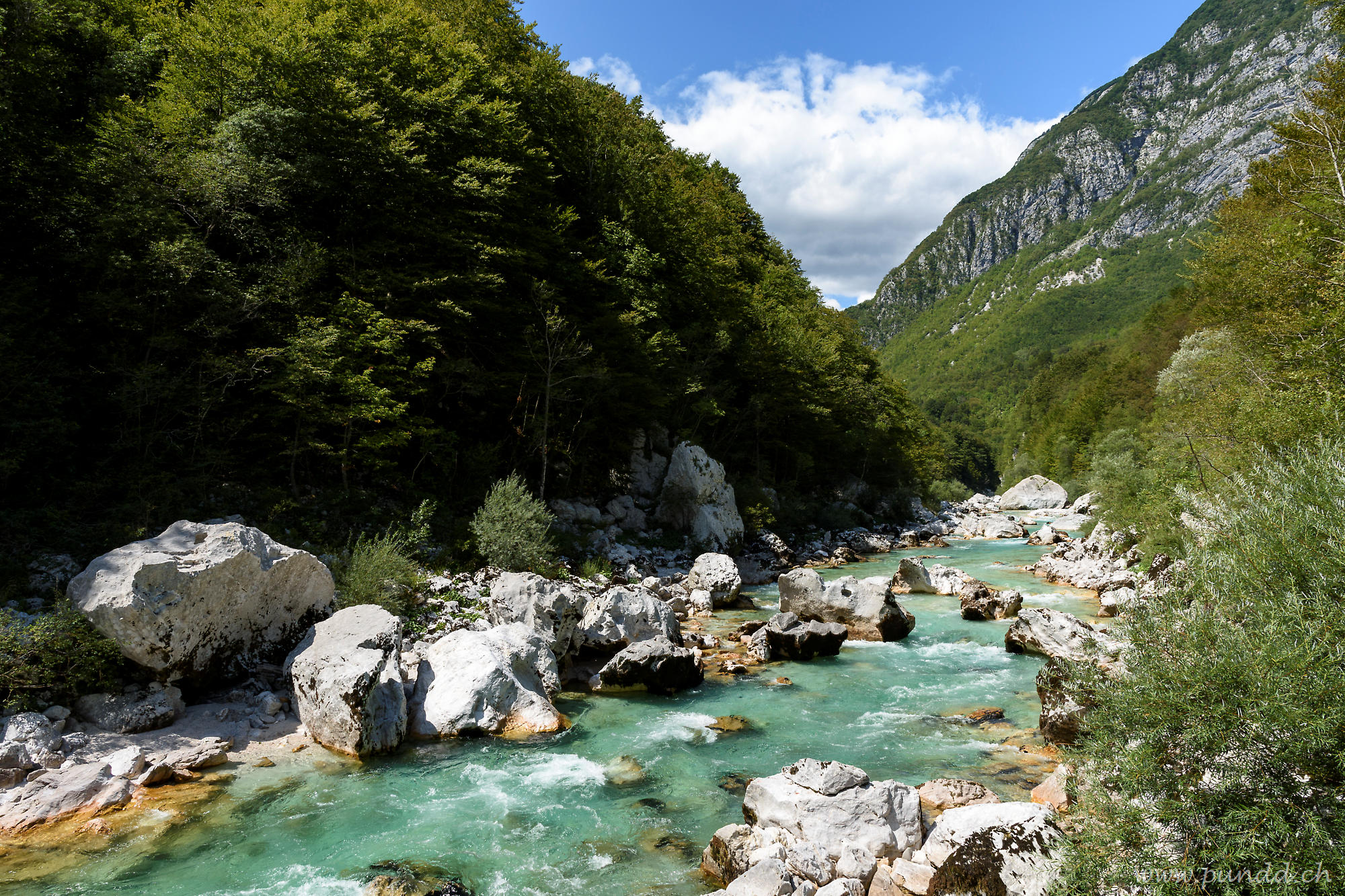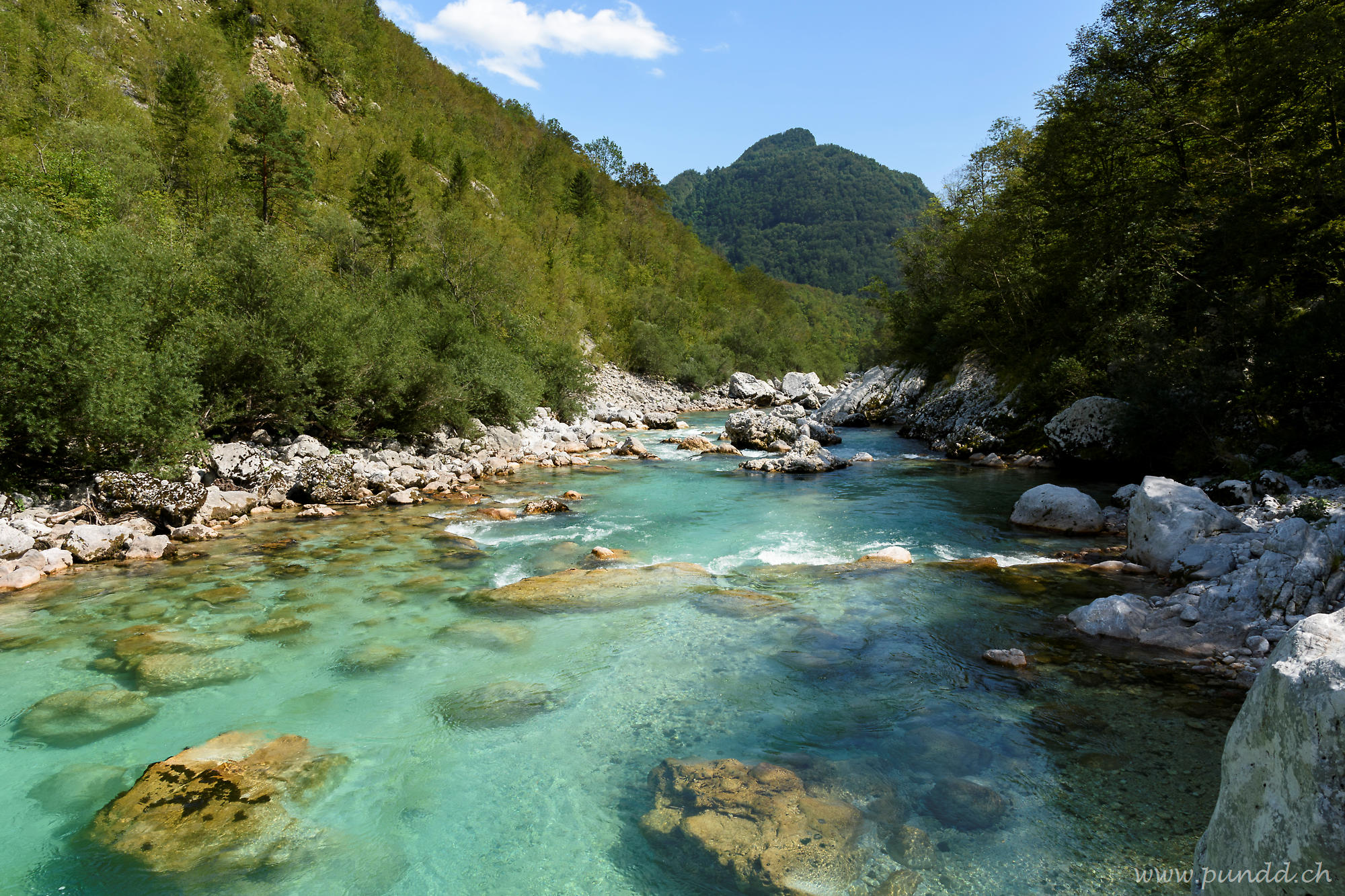 Bis zu unserem Ziel in Kobarid fuhren wir stets der Sǒca entlang. Wir waren gespannt, ob sie irgendwann noch grösser werden würde, hier sah sie noch nicht so wild aus.