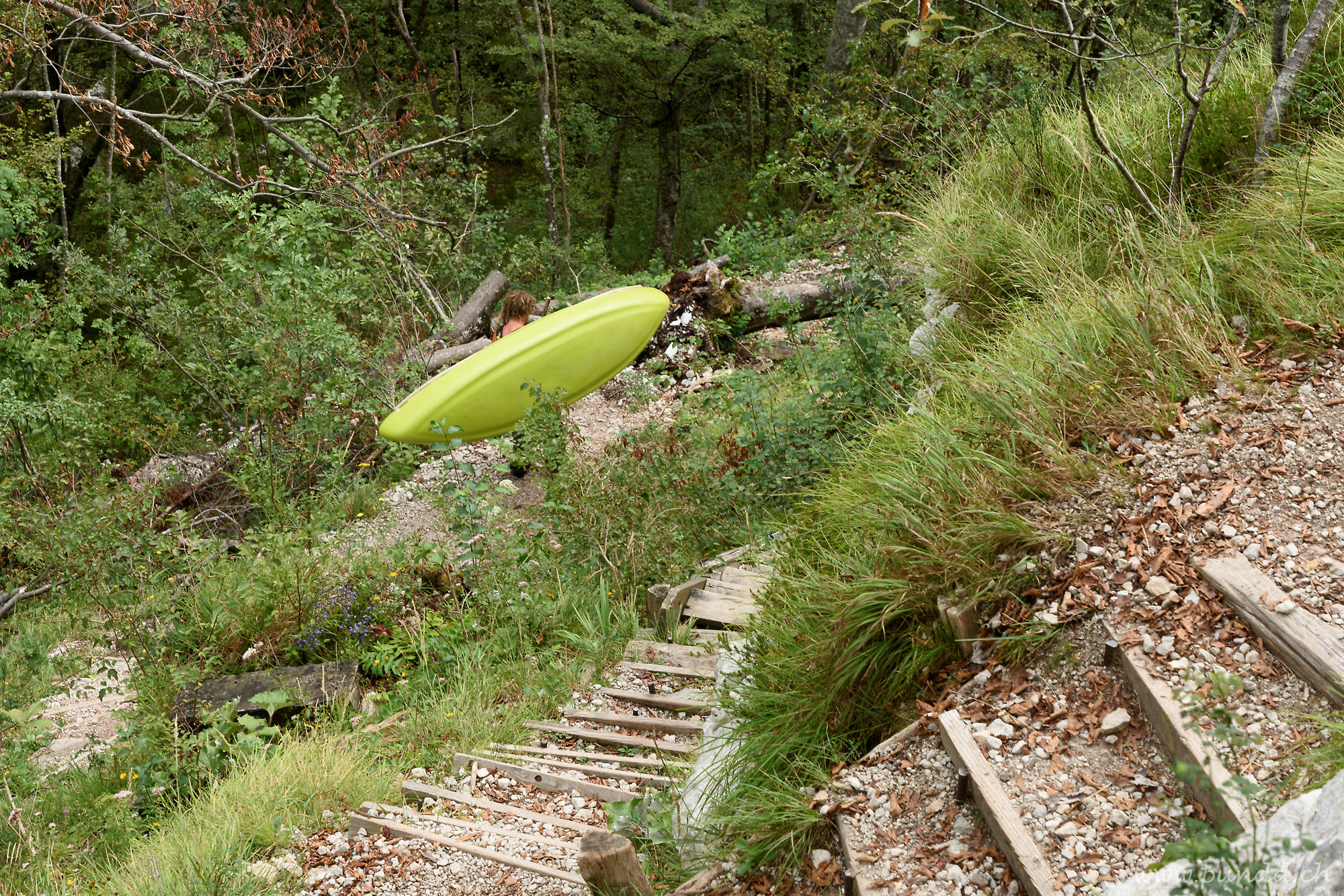 Abseilen müssen wir die Boote glücklicherweise nicht mehr, heute gibt's einen schönen Wanderweg hinunter zum Fluss. Dennoch ist es nicht ohne, die mit Beladung ungefähr 25 kg schweren Boote 120 Höhenmeter auf einem steilen Wanderweg hinunter zu tragen.