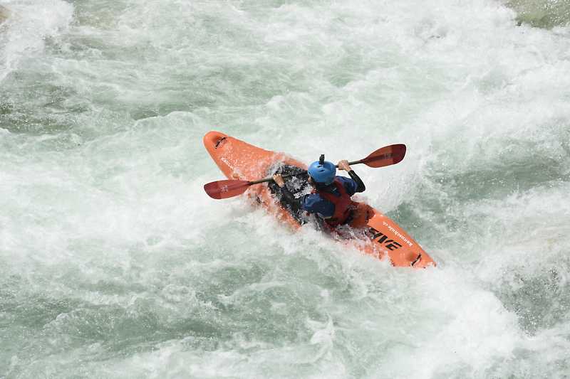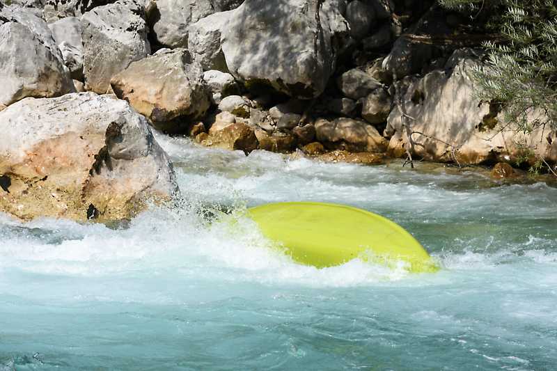 Die Eskimorolle ist auch beim Kanufahren sehr nützlich: Es ist deutlich schwieriger und langsamer mit dem Boot an Land zu schwimmen, als mit einem vollgelaufenen Boot zum nächsten grösseren Kehrwasser zu paddlen. Allerdings ist das Eskimotieren eine Kunst, die immer wieder geübt werden muss. Hier übt Peter mit der zusätzlichen Schwierigkeit vom Rollen in der Strömung.