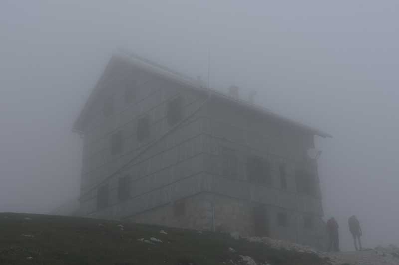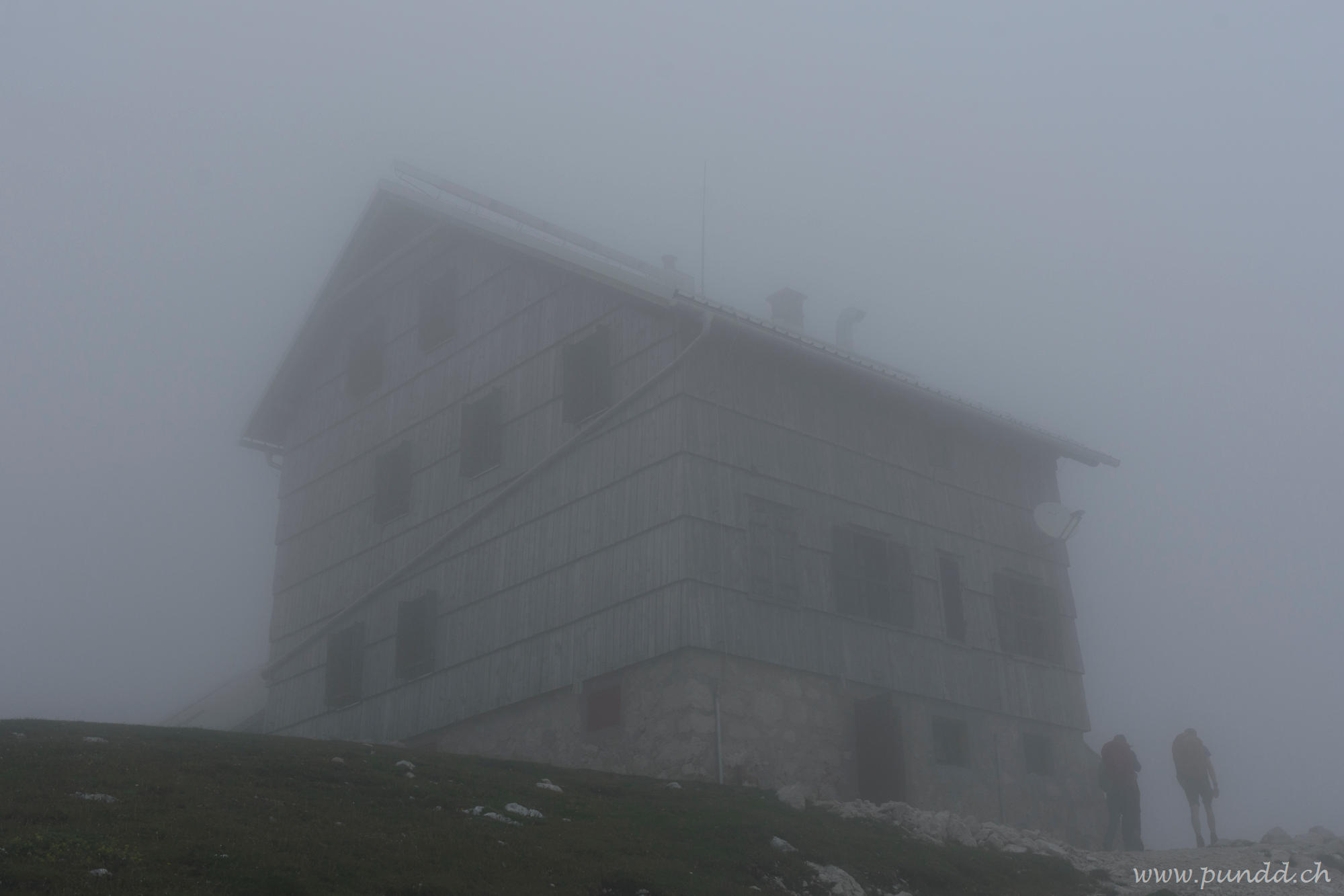 Beim letzten Aufstieg umhüllte uns plötzlich dichter Nebel, der von einem andern Tal hinüberwehte. So konnten wir die Hütte erst erkennen, als wir fast schon am Eingang angekommen waren. Die Hütte Dom Planika pod Triglavom liegt auf 2408 m Meereshöhe und ist eine sehr beliebte Ausgangsbasis zum 2864 m hohen Triglav.
