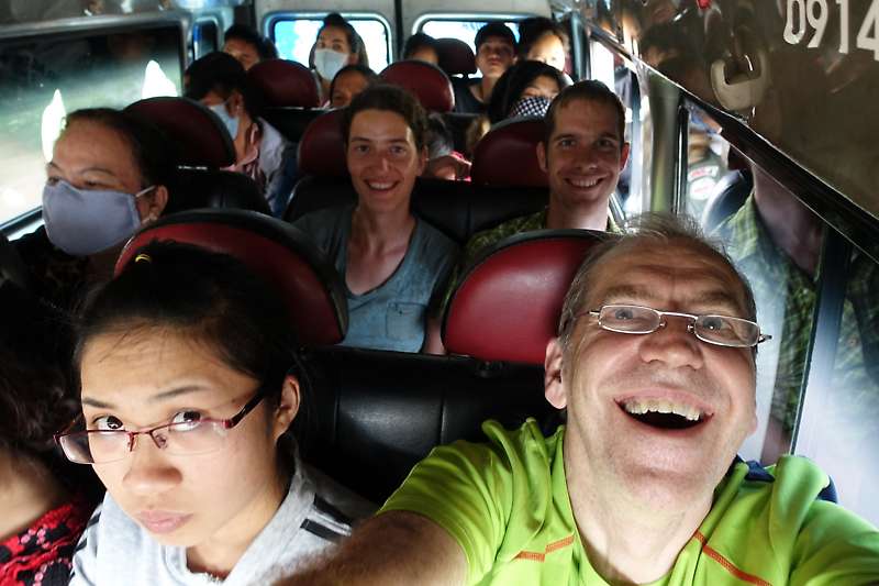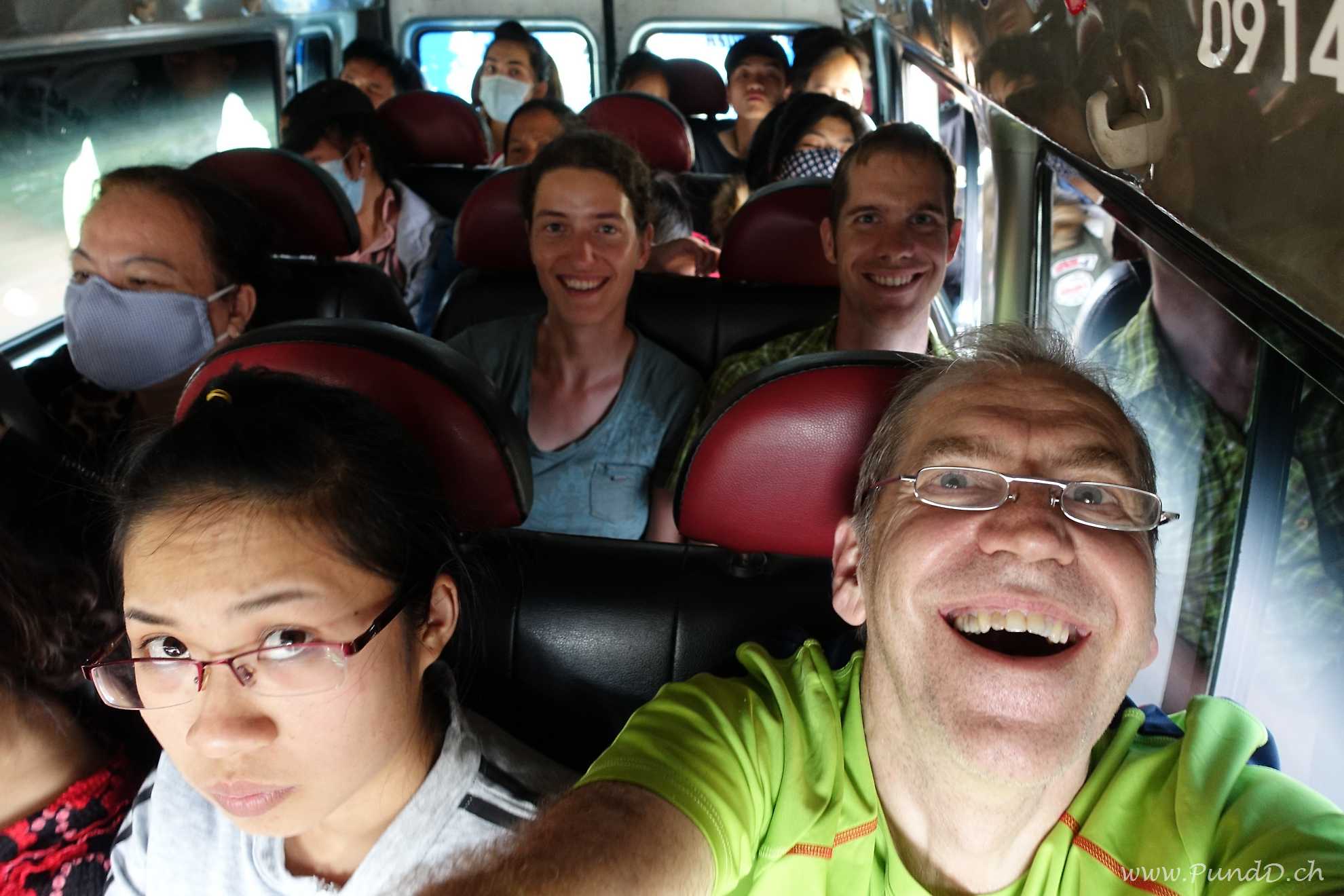 Vom Cat Tien Nationalpark fuhren wir direkt mit dem Minibus nach Dalat. Dies hatte sich gut anghört, so sollten wir problemlos und bequem direkt zu unserem nächsten Ziel gelangen. Die Fahrt war aber eher abenteuerlich als bequem: Der Busfahrer und sein Gehilfe versuchten nämlich, das Gefährt so voll wie möglich zu bringen. So hupte der Bus jeden an, der am Strassenrand stand und füllte sich allmählich bis zum Platzen. Schlussendlich sassen 28 Leute in dem für 16 Personen gemachten Minibus: Vier auf jedem für drei gemachtem Sitzbank, fünf vorne (zwei auf der Beifahrerseite, einer auf der Mittelkonsole und eine weitere Passagierin auf dem Fahrersitz neben dem Fahrer). Im Gang neben den Sitzen und im Kofferraum wurden auch Leute untergebracht. So beladen fuhren auf das bergige Dalat zu. Aufgrund der vielen Stopps dauerte die ganze Fahrt natürlich um einiges länger als geplant, schlussendlich erreichten wir Dalat nach fünfeinhalb Stunden im Minibus.