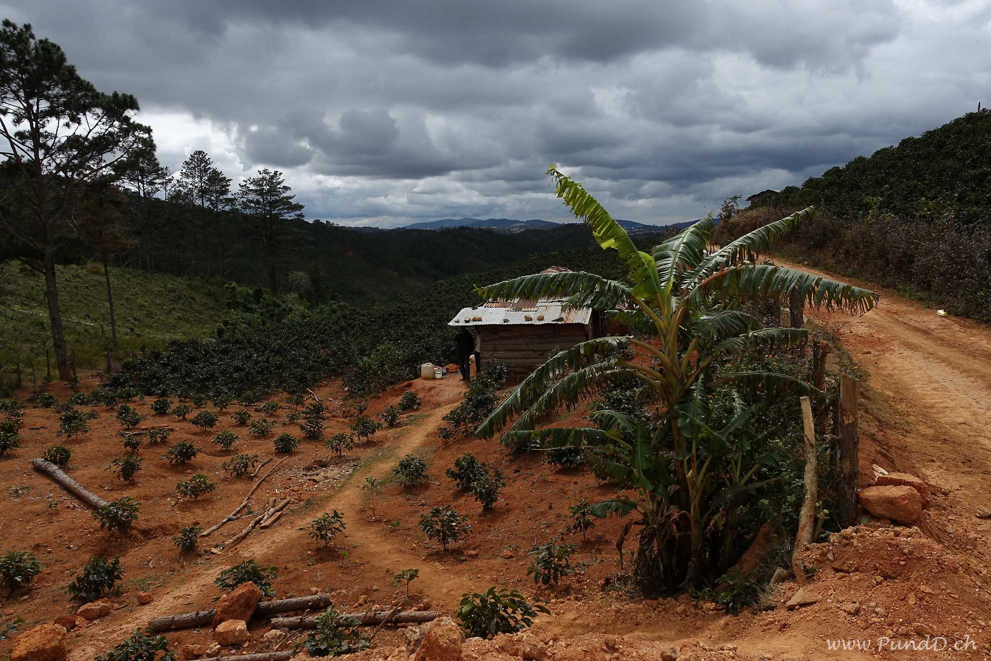 Nach Brasilien ist Vietnam der zweitgrösste Exporteur von Kaffee. Überalll um die Stadt sahen wir deshalb Kaffeeplantagen. Die verschiedenen Sorten konnten wir leicht an der grösse der Pflanzen unterscheiden: Der etwas mildere und säuerliche Arabica wächst als 1m kleiner Busch, der bittere Robusta wird mannshoch, einige weitere Sorten wachsen dagegen zu mehreren Metern hohen Büschen heran.