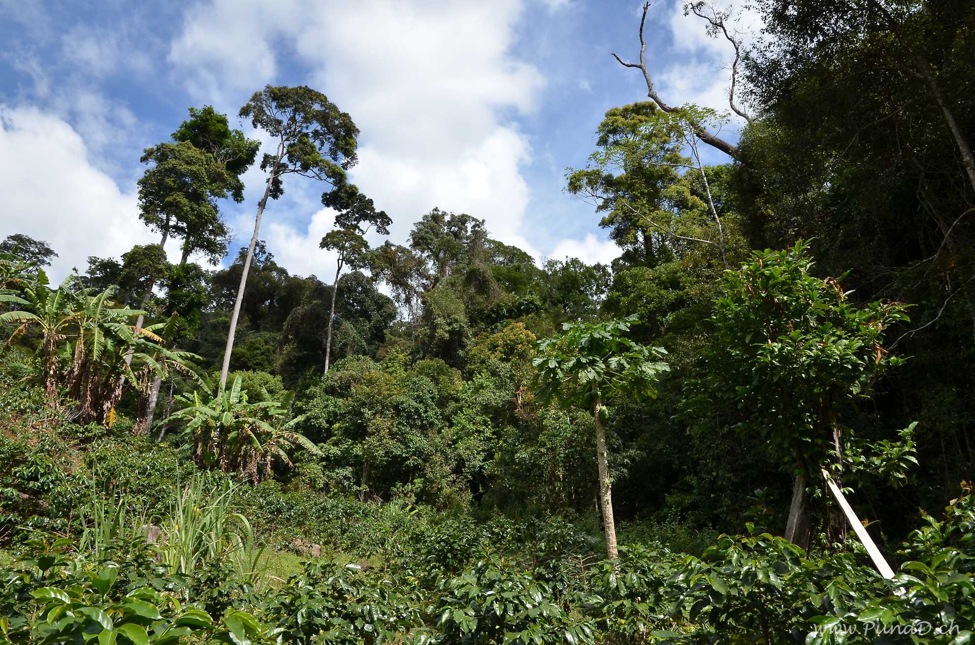 Den Feldern entlang wanderten wir hoch in Richtung des Urwaldes. An den Hängen wurden die Felder allmählich durch Kaffeeplantagen abgelöst, bis wir zuletzt in den ursprünglichen Urwald hineinliefen.