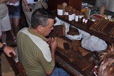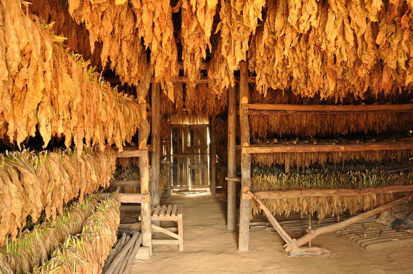 Ein weiterer Stopp war eine Tabakplantage. Die Plantagenbesitzer haben extra für die Touristen ein kleines Feld mit Tabakpflanzen am Leben gehalten, obwohl die Pflanzsaison schon lange vorbei war. Auch hier wird, wie wir überall am Wegrand gesehen haben, das Feld immer noch mit Ochsen gepflügt ? Traktoren scheinen noch keine grosse Verbreitung zu haben! Nebst der obligatorischen Vorführung des Zigarrendrehens gab es auch ein Trockenhaus für Tabak zu besichtigen, darin hängen die Blätter etwa zwei Jahre lang. Die Feuchtigkeit wird durch Öffnen und Schliessen der Türen geregelt.